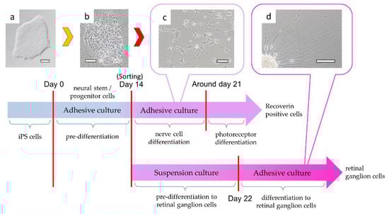 - Tanaka, T.; Yokoi, T.; Tamalu, F.; Watanabe, S.; Nishina, S.; Azuma, N. Generation of retinal ganglion cells with functional axons from human induced pluripotent stem cells. Sci. Rep. 2015, 5, 8344. [Google Scholar] [CrossRef] [PubMed]
