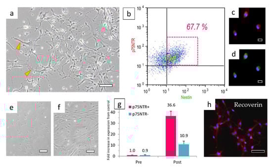 Cells sorted with p75NTR can concentrate Recoverin-positive cells. (a) Before p75NTR sorting, cells with large cytoplasms (arrowheads) were mixed. (b) Fixed cells were analyzed for p75NTR and Nestin by FCM. Most of the cells sorted in the strong positive region of p75NTR were double-positive for (c) p75NTR and (d) Nestin. (e,f) The morphology of cells sorted by their strong positivity for (e) p75NTR or (f) their weak positivity or negativity for p75NTR. (g) Relative semi-quantitative analysis of Recoverin gene expression in cells selected by p75NTR, and pre/post-differentiated cells. (h) Fluorescent immunostaining of Recoverin in differentiated cells. Bar in panel (a): 50 μm, bars in panels (c,d): 20 μm, bars in panels (e,f,h): 100 μm.