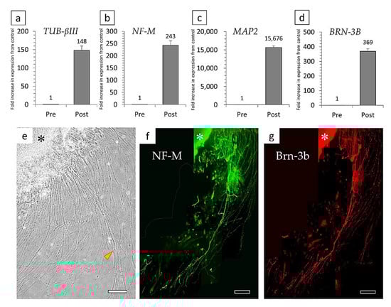 Relative semi-quantitative analysis of the gene expressions of (a) TUBULIN-βIII, (b) NEUROFILAMENT-M, (c) MAP2, and (d) BRN-3B in pre/post-differentiated cells. (e) An adhesive culture of cell aggregates (*) formed in suspension culture resulted in very long neurite outgrowth (arrowhead). (f,g) Fluorescent immunostaining results for markers of retinal ganglion cells: (f) Neurofilament-M, and (g) Brn-3b. Bars: 200 μm.