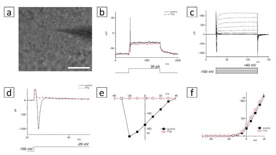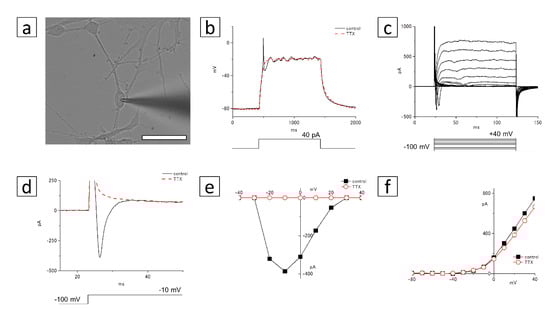We next confirmed the response of the membrane voltage and current in the Neurofilament-M- and Brn-3b-positive cells (Figure 10a). The action potential was generated by a depolarizing current injection (+20 pA), and it disappeared after the addition of 1 µM TTX under current-clamp conditions (Figure 10b). Although the transient inward currents were observed with the depolarizing stimulations, they were blocked by TTX under the voltage-clamp conditions (Figure 10c,d). The peak amplitude of the inward current was recorded at −20 mV (Figure 10e). The delayed rectifier outward currents were detected with depolarizing stimulation at −30 to +40 mV (Figure 10f), and they were not affected by TTX.