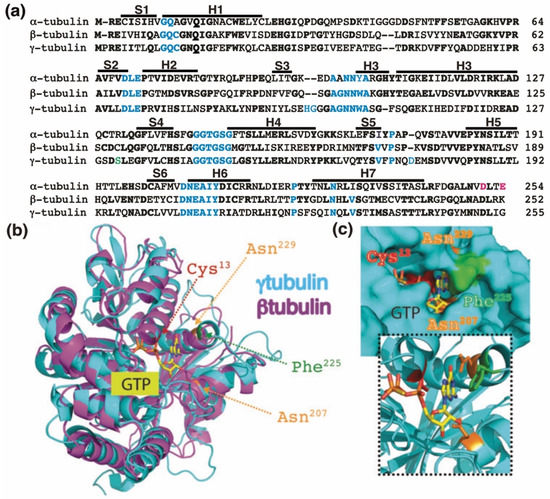 Figure 1. The GTP-binding domain. (a) Sequence alignment of the N-terminal GTP-binding domain (enclosing the first five α-helices and six parallel β-strands [16]) and nearby regulating sequences of human α-tubulin (residues 1–254; GenBank: AAA91576), β-tubulin (residues 1–252; GenBank: AAB59507.1), and γ-tubulin (residues 1–255; GenBank: AAV38734.1). Bold and magenta letters indicate identical and essential residues for the β-tubulin-mediated hydrolysis of GTP, respectively [21]. Residues involved in GTP binding are blue. Ser131 is labeled green. Helices (H) and strands (S) are indicated. (b) The known three-dimensional structures of β-tubulin (magenta) and γ-tubulin (cyan) with a view down the GTP-binding pocket, highlighting Cys13, Asn207, Phe225, and Asn229. (c) The molecular surface of the GTP/GDP-binding pocket of γ-tubulin is displayed, and GTP is shown in a stick representation. The inset (dashed lines) shows GTP together with the protein with only the side-chains of Cys13, Asn207, Phe225 and Asn229 displayed. (b,c) Reproduced with permission from B.O. Villoutreix; published by American Association for Cancer Research, 2015 [30].