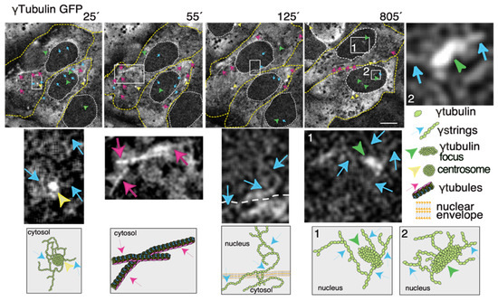 Figure 3. The dynamics of the γ-tubulin meshwork in living cells. Time-lapse series of fluorescence images showing U2OS cells stably coexpressing TUBG-short hairpin (sh)RNA and GFP-tagged sh-resistant γ-tubulin (γtubulin GFP). Images present chosen frames illustrating the changes in the position of γ-strings, γ-tubules, centrosomes, and γ-tubulin foci during the interphase. The outer membrane of the cells and the nuclei are indicated by dotted yellow and white lines, respectively. Yellow arrowheads, blue arrows, and magenta arrows indicate centrosomes, γstrings, and γ-tubules, respectively. Green arrowheads denote nucleating γ-tubulin foci. The images shown were collected every 5 min and represent selected frames showing the changes that γstrings, γ-tubules, centrosomes, and γ-tubulin foci undergo during interphase. White boxes indicate the areas magnified in the inset. Scale bars: 10 μm. The lower panels are schematic representations of the structures shown in the corresponding white box. See Videos S1–S3. The stable cell line was obtained, and time-lapse experiments were performed as previously described [10,12,35]. These data are from unpublished works by Alvarado-Kristensson et al.