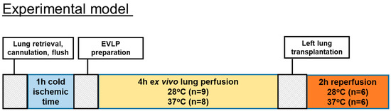 Recipient animals were anaesthetized with a mixture of oxygen and isoflurane, and intubated. Anaesthesia was maintained with 1–2% isoflurane during the operation and reperfusion period. For measuring the airway pressure during the procedure, a three-way stopcock was inserted between the intratracheal tube and the ventilator circuit and was connected to a pressure transducer. A left thoracotomy was performed through the fifth intercostal space. The left lung was mobilized by dividing the pulmonary ligament. The hilum of the left lung was dissected, and the pulmonary artery, pulmonary vein and the left main bronchus were isolated. All three structures were clamped by using microsurgical aneurysm clamps. They were incised on their anterior aspect, and the cuffs of the donor lung were placed into the equivalent recipient structures and fixed with a 6–0 polypropylene suture. The transplanted lung was inflated and pulmonary vein and arterial clamps were released, respectively. The thoracotomy was closed loosely. The recipient animal got ventilated (with 2–3% (v/v) isoflurane in O2, a tidal volume of 10 mL/kg at 75 breaths/min, and a PEEP of 3 cmH2O) for 2 h [3]. During these 2 h, we analyzed the left lung function. After 2 h, oxygenation of the graft was evaluated by sampling the blood directly from the pulmonary vein of the transplanted lung by means of heparinized needle aspiration inserted distally to the anastomotic cuff and, finally, the heart-lung block got explanted. For further biochemical analysis, an aliquot of the left lungs was flash frozen in liquid nitrogen. All samples were stored at −80 °C until further examinations. Six transplantations were performed in the normothermic and subnormothermic groups. The timeline of the animal study is shown in Figure 1.