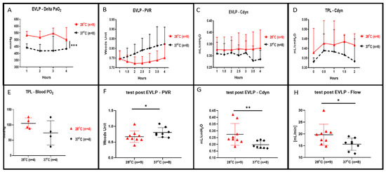 Lung oxygenation, pulmonary vascular resistance (PVR), dynamic compliance (Cdyn) and flow during 4 h of ex vivo lung perfusion (EVLP) and after 2 h of transplantation. (A) Perfusate oxygenation was significantly improved in EVLP done at 28 °C when compared to EVLP done at 37 °C temperature (*** p < 0.001). (B) PVR during the 28 °C EVLP was lower but not statistically different from the EVLP done at 37 °C. (C) Cdyn during the 28 °C EVLP was higher but were not statistically different from the EVLP done at 37 °C. (D) During 2 h of post EVLP transplantation reperfusion time, the compliance measured from the rat allocated to the 28 °C EVLP group was higher but not statistically different from the compliance of transplanted lungs originating from the EVLP done at 37 °C. (E) At the end of the 2 h post-transplantation reperfusion, the oxygenation from the pulmonary vein was higher in the lungs allocated from the 28 °C EVLP group but was not statistically different when compared to the control group. (F) In the 28 °C EVLP group and during the 5 min end of EVLP stress test we recorded a significant lower PVR (* p < 0.05) and (G) a significantly higher Cdyn (* p < 0.05, ** p < 0.01) and (H) a significantly higher flow (* p < 0.05) when compared to the normothermic group.