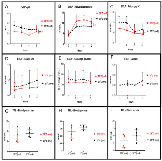 Perfusate concentration of potassium (shown in Figure 3D), percentage changes of glucose (shown in Figure 3E) and lactate (shown in Figure 3F) during the 4 h of EVLP at 28 °C were slightly reduced but were not statistically different when compared to 37 °C. At 28 °C, perfusate values of pH (shown in Figure 3A, p < 0.001) and of anion gap K+ (shown in Figure 3C, p < 0.05) were significantly lower whereas values of bicarbonate were significantly higher (shown in Figure 3B, p < 0.05). Plasma levels of potassium (shown in Figure 3G), glucose (shown in Figure 3H) and lactate (shown in Figure 3I) at the end of the 2 h reperfusion in transplanted rats allocated from in 28 °C EVLP group were reduced but were not statistically different when compared to the control group.