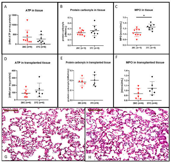 After the 4 h of EVLP at 28 °C we observed that the lung tissue ATP content was higher (shown in Figure 4A) and the protein carbonyl tissue content was lower (shown in Figure 4B) although they were not statistically different from that of the lung tissue perfused at 37 °C. This decrease in protein carbonyl tissue content after EVLP done at 28 °C was also observed in the lung tissue after 2 h of transplantation (shown in Figure 4E). For the transplanted lung tissue, the ATP content was rather higher in the 37 °C group, although not statistically different from that of the lung tissue content of ATP after EVLP done at 28 °C (shown in Figure 4D).