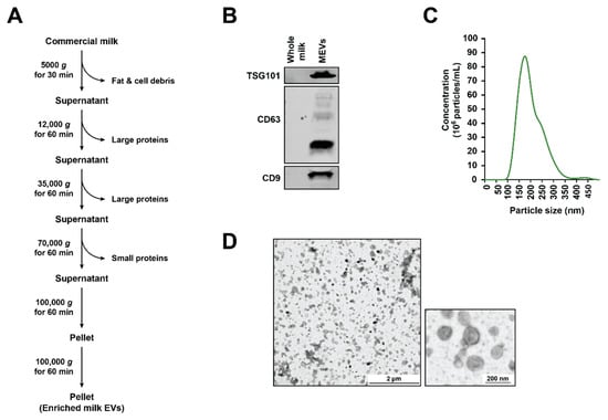 Characterization of milk-derived extracellular vesicles (MEVs). (A) Schematic diagram of MEVs isolation. (B) Western blotting analysis of 30 µg of MEVs and whole milk probed with TSG101. (C) Nanoparticle tracking analysis of MEVs with the highest peak at 170 nm. (D) Transmission electron miscopy (TEM) images suggested the presence of vesicles in the preparation.