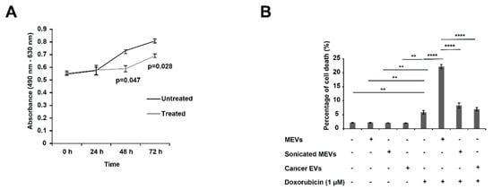 When seeding cells (5 × 103 per 100 μL), 96-well plates were used. The cells were incubated for 24 h at 37 °C in 5% CO2 before further incubating with MEVs (100 µg/mL) or sonicated MEVs (100 µg/mL) or doxorubicin (1 µM) or a combination treatment of doxorubicin and MEVs or sonicated MEVs. The plates were then read for 0 h and every 24 h in the presence of 20 µL of 3-(4,5-dimethylthiazol-2-yl)-5-(3-carboxymethoxyphenyl)-2-(4-sulfophenyl)-2H-tetrazolium (MTS) solution (Phenazine methosulfate (PMS) reagent (Sigma Life Science®, NSW, Australia) in DPBS and CellTiter 96® AQuueous MTS reagent powder (Promega, Alexandria, NSW, Australia) according to the manufacturer’s instructions). The plates were then incubated for 1.5 h after the addition of MTS solution. Plates were read using the SpectraMaxM5 multi-mode microplate reader (Molecular Devices) and the absorbance wavelengths used were 490 nm and 630 nm.