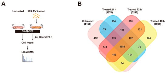 Proteomic analysis of cells treated with MEVs. (A) Schematic diagram of sample preparation from label-free quantitative proteomic analysis. (B) Venn diagram of proteins distributed between untreated, 24, 48 and 72 h MEVs (100 μg/mL) treated SK-N-BE2 cells. n = 3 biological replicates.