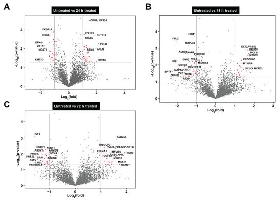 Depiction of differentially abundant proteins via volcano plots. (A) Volcano plot depicting the differential abundance of proteins in 24 h treated NBL cells compared to untreated. (B) Representation of differential abundance of proteins in 48 h treated NBL cells compared to untreated. (C) Volcano plot of differentially abundant proteins at 72 h. Y axis= p-value of the protein expression X axis = ±2-fold changed proteins.
