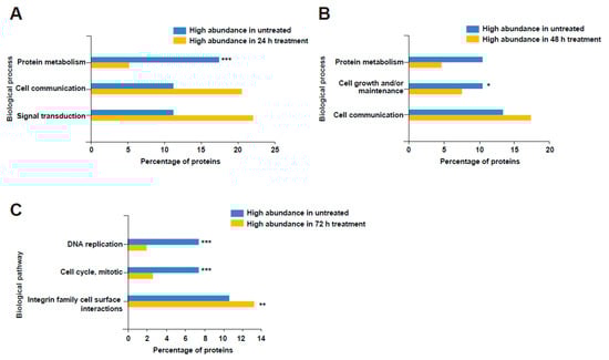 Gene enrichment analysis revealed the enrichment of proteins involved in cellular growth in untreated NBL cells. (A) Proteins that are 2-fold differentially abundant in 24 h treated and untreated NBL cells were subjected to enrichment analysis for biological process. (B) Proteins that are 2-fold differentially abundant in 48 h treated and untreated NBL cells were subjected to enrichment analysis for biological process. (C) Gene enrichment analysis of biological pathways affected by MEV treatment at 72 h. * denotes p < 0.05, ** denotes p < 0.01 and *** denotes p < 0.001 as determined by hypergeometric test.