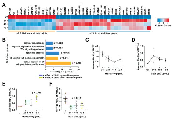 Next, to confirm the changes in obtained biological processes, the average NspC values were plotted for some of the proteins that is known to contribute in proliferation, apoptosis and Wnt signalling pathways. Proliferation regulators MKI67 (Figure 6C) and MAP2K4 (Figure 6D) were altered upon MEV treatment [,]. Apoptosis regulator ROR2 [] was significantly upregulated in 72 h MEVs treated cells compared to untreated (Figure 6E). ROR2 is also known to participate in negative regulation of Wnt signalling activity. This observation was further confirmed by the depletion of KMT2D (Figure 6F), a protein involved in Wnt signalling pathway [], in MEV-treated NBL cells. Overall, these results suggest that the treatment of NBL cells with MEVs attenuates proliferation and Wnt signalling pathway while inducing senescence.