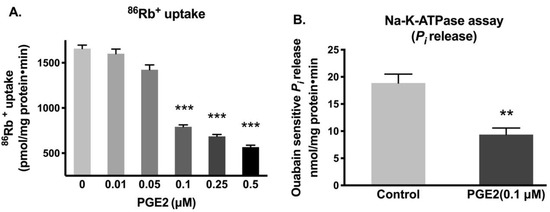 Effect of PGE2 exposure for 24 h on Na-K-ATPase activity in IEC-18 cells. (A). Measurement of Na-K-ATPase activity by 86Rb+ uptake (n = 6, Dunnett’s multiple comparison). (B). Measurement of Na-K-ATPase activity by Pi release in plasma membrane preparations (n = 4, t-test). Values are represented as means ± SEM. ** p < 0.01 and *** p < 0.001 vs. 0 µM or control.