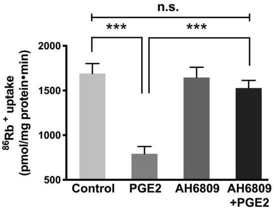 Effect of PGE2 (0.1 µM) receptor inhibitor AH6809 (5 µM) on Na-K-ATPase activity in IEC-18 cells. Measurement of Na-K-ATPase activity by 86Rb+ uptake. Values are represented as means ± SEM (n = 6, Tukey’s multiple comparison). *** p < 0.001; n.s., not significant.