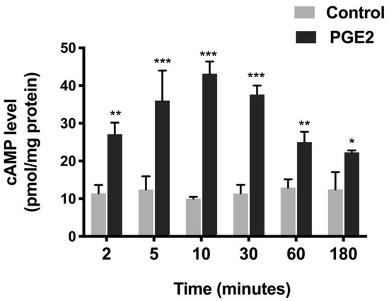 Level of cAMP at different time points during PGE2 (0.1 µM) treatment. Values are represented as means ± SEM (n = 8, t-test). * p < 0.05, ** p < 0.01, and *** p < 0.001 vs. Control. Levels of cAMP in controls did not change significantly at different time points.