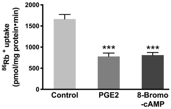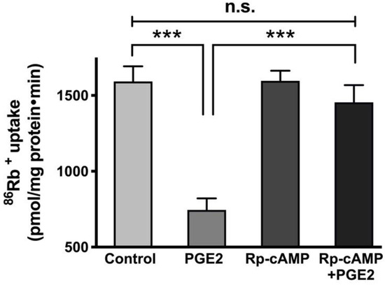 Effect of PGE2 (0.1 µM) and PKA inhibitor Rp-cAMP (10 µM) on the Na-K-ATPase activity in IEC-18 cells. Measurement of Na-K-ATPase activity by 86Rb+ uptake. Values are represented as means ± SEM (n = 6, Tukey’s multiple comparison). *** p < 0.001; n.s., not significant.