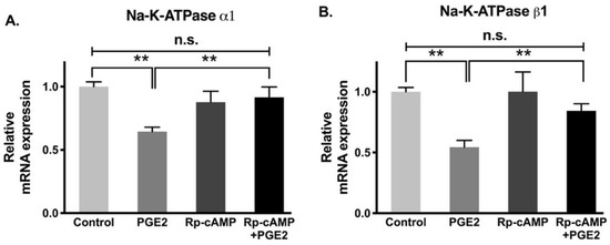 qRT-PCR analysis of IEC-18 cells with PGE2 (0.1 µM) and Rp-cAMP (PKA inhibitor, 10 µM). Values are relative to the control and normalized to β-actin. (A). Na-K-ATPase α1. (B). Na-K-ATPase β1. Values are represented as mean ± SEM (n = 4, Tukey’s multiple comparison). ** p < 0.01; n.s., not significant.