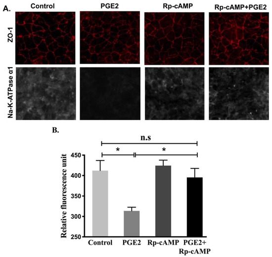 Immunocytochemistry of IEC-18 cells treated with PGE2 (0.1 µM) and Rp-cAMP (PKA inhibitor, 10 µM). (A). Representative images of Na-K-ATPase α1 (grey) and ZO-1 (red) (20X). (B). Quantification of Na-K-ATPase α1 fluorescence. Values are represented as mean ± SEM (n = 6, Tukey’s multiple comparison). * p < 0.01 vs. Control.