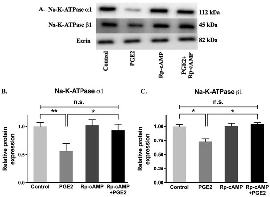 Western blot analysis of IEC-18 cells treated with PGE2 (0.1 µM) and Rp-cAMP (PKA inhibitor, 10 µM). (A). Representative western blot of Na-K-ATPase α1, Na-K-ATPase β1, and Ezrin (internal control). Densitometric quantitation of blots. (B) Na-K-ATPase α1 and (C) Na-K-ATPase β1. Values are relative to the control and normalized to Ezrin. Values are represented as mean ± SEM (n = 4, Tukey’s multiple comparison). * p < 0.05 and ** p < 0.01; n.s., not significant.