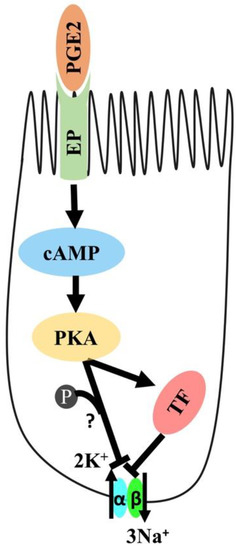 The current study indicates that PGE2 reduces Na-K-ATPase activity via the cAMP-mediated PKA pathway, as shown in Figure 10. The mechanism involves the binding of PGE2 to prostaglandin receptors, leading to increased intracellular cAMP production and the subsequent activation of the PKA pathway, which eventually leads to a decrease in the Na-K-ATPase activity. The reduction in activity is due to transcriptional repression of genes encoding the α1 and β1 subunits of Na-K-ATPase.