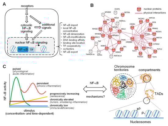 Pathways and dynamics of nuclear NF-κB activation. (A) The NF-κB signaling system consists of a cytosolic and a nuclear part, where NF-κB associates with chromatin regulators and transcription factors (TF) to control gene expression. The bracket highlights multiple levels of regulation of nuclear NF-κB. (B) Known and experimentally determined physical interactions of the five NF-κB subunits (REL, RELB, RELA, NFKB1, and NFKB2) with proteins localizing to the nucleus (in red) based on STRING database entries (https://string-db.org (accessed on 4 March 2021)). (C) The left part shows five modes of the kinetics of NF-κB activation over time in response to a range of triggers, reflecting prototypical physiological or pathological conditions. A major question in the field is how this dynamics relates to the different levels of chromatin organization inside the nucleus, as shown on the right. The various layers of chromatin structures within the nucleus, ranging from chromosome territories down to DNA wrapped around the nucleosomes, are displayed. Ac, acetylation; P, phosphorylation; TAD, topologically associating domain.