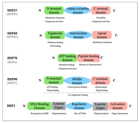 Schematic structure of HSP27 (HSPB1), HSP60 (HSPD1), HSP70 (HSPA), HSP90 (HSPC) and HSF1. The main functions of each domain are specified. HSP: Heat Shock Protein; HSF1: Heat Shock Factor 1; HSE: Heat Shock Element; PTMs: Post Translational Modifications.