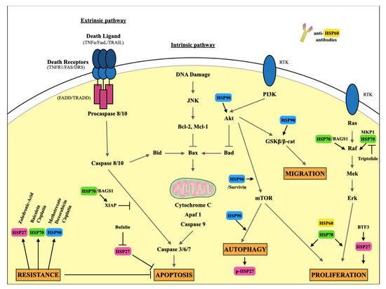 HSPs also promote carcinogenesis directly by regulating cell proliferation and inhibiting apoptosis, resulting in the promotion of resistance mechanisms. As a first example, HSP27 is involved in cell cycle progression, repressing cell cycle inhibitory proteins E2F-4 and p130 [33]. HSPs also help cancer cells escape apoptosis by blocking protein intermediates in the signaling pathways governing programmed cell death [34,35,36]. HSP90 is also known to stabilize telomerase in certain forms of cancer [37]. Furthermore, HSPs are described as promoting invasion and metastasis. HSP27 is effectively necessary for invasion and metastasis triggered by hepatocyte growth factor (HGF) [38] and is involved in the regulation of matrix metalloproteinase 9 (MMP9), a major invasion mediator [39]. HSP90 or HSP70 imbalance has also been shown to disturb key proteins involved in migration and invasion, such as focal adhesion kinase (FAK) and the Wiskott–Aldrich syndrome protein family member 3 (WASF3) [40,41].