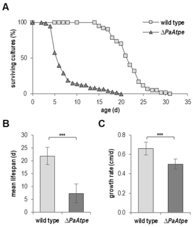 For practical reasons, we performed experiments on agar plates. Therefore, we first analyzed whether the effects on lifespan obtained in race tubes in the earlier study [26] also occur on agar plates. We found the mean lifespan was reduced by 66.5% (21.8 d vs. 7.3 d) and the maximal lifespan by 35.5% (20 d vs. 31 d) (Figure 1A,B), which was even more pronounced than in race tubes. Also, as expected from the initial study, the growth rate of the PaAtpe deletion mutant was reduced (Figure 1C).