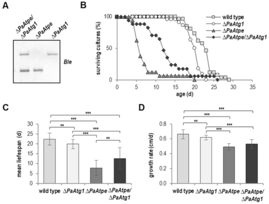 Figure 4. Autophagic processes contributes to lifespan decrease of ΔPaAtpe. (A) Southern blot analysis verifies the newly generated double deletion mutant ΔPaAtpe/ΔPaAtg1 by the phleomycin (Ble) resistance genes (B) Survival curve of P. anserina wild type (n = 26), ΔPaAtg1 (n = 22; p = 2.6 × 10−3), ΔPaAtpe (n = 16; p = 7.5 × 10−11) and ΔPaAtpe/ΔPaAtg1 (n = 17; p = 2.6 × 10−8) grown on standard M2 medium. (C) Mean lifespan and (D) mean growth rates of cultures from (B). Error bars correspond to standard deviation. The p-values of the survival curves were determined by SPSS with three different tests and for mean lifespan and growth rate by two-tailed Student’s t test. ** p < 0.01; *** p < 0.001.