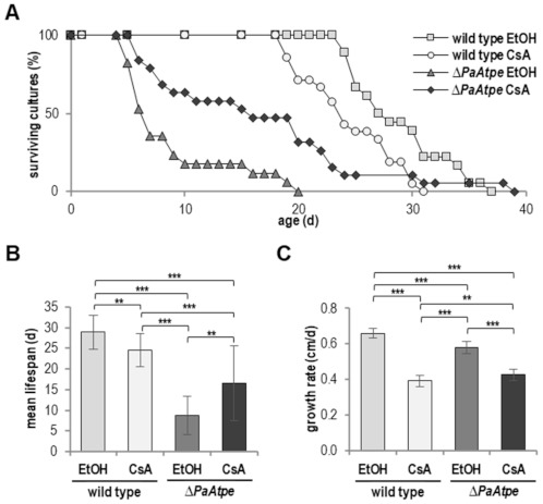 Figure 5. Inhibition of mPTP partially restores lifespan of ΔPaAtpe. (A) Survival curve of P. anserina wild type and ΔPaAtpe grown on standard M2 medium with ethanol (EtOH) as control or cyclosporine A (CsA) (each 18 biological replicates). (B) Mean lifespan and (C) mean growth rates of cultures from (A). Error bars correspond to the standard deviation. The p-values of the survival curves were determined by SPSS with three different tests and for mean lifespan and growth rate by two-tailed Student’s t test. ** p < 0.01, *** p < 0.001.