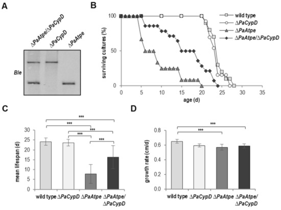 In order to avoid such side effects of the chemical inhibition by CsA, we next analyzed a newly generated ΔPaAtpe/ΔPaCypD double deletion mutant. In this mutant, both the PaAtpe and the PaCypD genes were replaced by a phleomycin resistance cassette (Ble) (Figure 6A). Strikingly, compared to the lifespan of ΔPaAtpe and like the chemical inhibition of PaCYPD, impairment of mPTP resulting from the ablation of PaCYPD revealed an increase in lifespan of the ΔPaAtpe/ΔPaCypD double deletion mutant (Figure 6B). In contrast, the lifespan of the single PaCypD deletion mutant was unchanged when compared to the wild type (Figure 6B). The simultaneous ablation of both genes caused a 20% enhanced maximal lifespan (24 d vs. 20 d) and a 107.7% increased mean lifespan (16.2 d vs. 7.8 d) (Figure 6B,C), indicating that lifespan reduction after ablation of PaATPE was PaCYPD-dependent, and thus, mPTP-mediated.