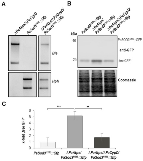 Figure 7. Mitophagy induction in ΔPaAtpe is dependent of PaCYPD. (A) Southern blot analysis verifies the newly generated double mutant ΔPaAtpe/ΔPaCypD/PaSod3H26L::Gfp by the phleomycin (Ble) and hygromycin (Hph) resistance genes. (B) Monitoring mitophagy by western blot analysis of total protein extract from PaSod3H26L::Gfp, ∆PaAtpe/PaSod3H26L::Gfp and ∆PaAtpe/∆PaCypD/PaSod3H26L::Gfp cultures with a GFP-antibody (each 4 biological replicates). (C) Quantification of “free GFP” protein levels from (B) normalized to the Coomassie stained gel. Protein level in PaSod3H26L::Gfp cultures were set to 1. Error bars correspond to the standard deviation and p-values were determined by two-tailed Student’s t test. ** p < 0.01, *** p < 0.001.