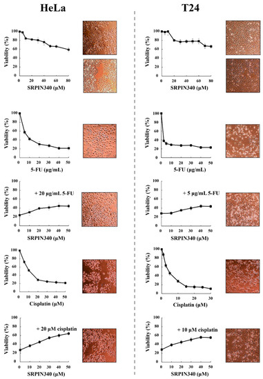 SRPIN340 protected HeLa and T24 cells from the cytotoxic effects of 5-FU and cisplatin. HeLa cells (left panel) were treated with SRPIN340 (5–80 µM) for 48 h, 5-FU (5–50 μg/mL) for 48 h, 5-FU (20 μg/mL) plus SRPIN340 for 48 h, cisplatin (5–50 µM) for 24 h, or cisplatin (20 µM) plus SRPIN340 for 24 h. T24 cells (right panel) were treated with SRPIN340 (5–80 µM) for 48 h, 5-FU (2.5–50 μg/mL) for 48 h, 5-FU (5 μg/mL) plus SRPIN340 for 48 h, cisplatin (1–30 µM) for 48 h, or cisplatin (10 µM) plus SRPIN340 for 48 h. The number of viable cells was measured using an MTT assay. Viability is expressed as a percentage of the viability of untreated cells, which was set to 100 percent. The density and morphology of control and treated cells were also observed using an inverted phase-contrast microscope at 10× magnification. Images were captured at the same time points as the respective MTT assays.