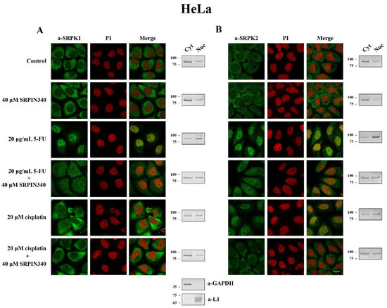 While on its own, SRPIN340 did not affect the predominant cytoplasmic localization of SRPK1, it did significantly prevent the nuclear translocation of the kinase in 5-FU-treated HeLa (Figure 5A, left panel) and T24 cells (Figure 6A, left panel), corroborating previous reports that the kinase activity is critical for the entry of SRPK1 into the nucleus [6,8]. A similar effect of SRPIN340 was also observed in cisplatin-treated cells, even though SRPK1 relocalized to the nucleus to a lesser extent (Figure 5A, left panel; Figure 6A, left panel). Interestingly, we noticed that despite the significantly more pronounced nuclear translocation of SRPK1 in 5-FU-treated cells than in cisplatin-treated cells, co-treatment with SRPIN340 protected the cells from both drugs; furthermore, the observed resistance was somewhat higher in cisplatin-treated cells than in 5-FU-treated cells. Considering that SRPIN340 inactivates both SRPK1 and SRPK2 [36], as well as previous reports in the literature showing that SRPK2 relocalized in the nucleus upon cisplatin treatment [13,22], we next examined the subcellular distribution of SRPK2 following 5-FU or cisplatin treatment. As shown in Figure 5B’s left panel (HeLa cells) and Figure 6B’s left panel (T24 cells), both 5-FU and cisplatin caused an almost complete nuclear translocation of SRPK2, while co-treatment with SRPIN340 hindered the nuclear accumulation of the kinase. Cellular fractionation experiments confirmed the immunofluorescence data (Figure 5 and Figure 6, right panels). Taken together, the above findings indicate that the kinase nuclear translocation and activity were essential to the involvement of SRPKs in the cytotoxicity of 5-FU and cisplatin.