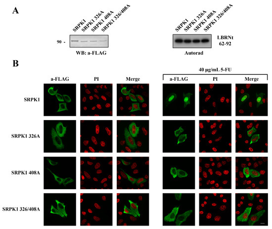 The following are available online at https://www.mdpi.com/article/10.3390/cells10040759/s1, Figure S1: Phosphorylation of Ser51 is not responsible for the nuclear translocation of SRPK1. Fluorescent pattern of wild-type FLAG-SRPK1 and mutant FLAG-SRPK151A in 5-FU-treated HeLa cells. The concentration of 5-FU was raised to 40 μg/mL to achieve complete nuclear translocation of FLAG-SRPK1. SRPK1 was detected using the M5 anti-FLAG monoclonal antibody, while nuclei were stained with PI. Scale bar, 10 µM; Figure S2: Akt and DNA-PK are not responsible for phosphorylation of Thr326 and Ser408. Phosphorylation of GST-SRPK1, GST-SRPK1326A, GST-SRPK1408A and GST-SRPK1326/408A by recombinant Akt1 (A) and DNA-PK (B). (C) M059K and M059J cells were treated with 20 µg/mL 5-FU for 48 h and stained for SRPK1 using the anti-SRPK1 monoclonal antibody. Nuclei were stained with PI. Scale bar, 10 µM.