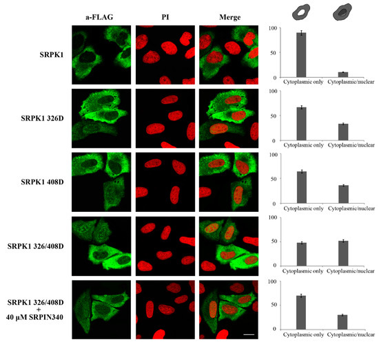 The phosphorylation-mimicking mutants of SRPK1 were partially localized in the nucleus. Representative confocal images of wild-type FLAG-SRPK1, FLAG-SRPK1326D, FLAG-SRPK1408D, FLAG-SRPK1326/408D, and FLAG-SRPK1326/408D plus SRPIN340. SRPK1 was detected using the M5 anti-FLAG monoclonal antibody, while the nuclei were stained with PI. Scale bar: 10 µM. A diagrammatic representation of wild-type FLAG-SRPK1 and mutant FLAG-SRPK1 staining patterns is shown in the upper part of the right panel. The percentage of SRPK1 staining patterns relative to the indicated staining pattern was determined for ≈150 cells in two different experiments, where the means ± standard errors of the measurements are shown.