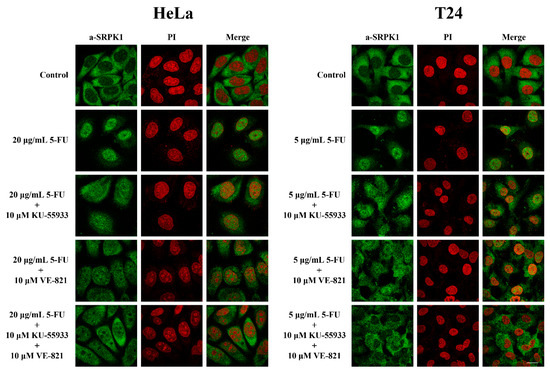 ATR/ATM inhibition significantly prevented the nuclear translocation of SRPK1 in 5-FU-treated HeLa and T24 cells. Fluorescent patterns of SRPK1 in HeLa (left panel) and T24 cells (right panel) treated either alone with 5-FU (20 µg/mL in HeLa, 5 µg/mL in T24) for 48 h, or co-treated for 48 h with 5-FU plus 10 µM KU-55,933, 5-FU plus 10 µM VE-821, or 5-FU plus 10 µM KU-55,933 plus 10 µM VE-821. SRPK1 was detected using the anti-SRPK1 monoclonal antibody, while nuclei were stained with PI. Scale bar: 10 µM.