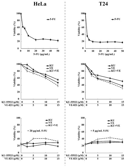 According to our previous data, preventing the nuclear translocation of SRPK1 via pharmacological inhibition of ATR/ATM should exert a beneficial effect on 5-FU-treated cells. To address this issue, we tested the viability of HeLa and T24 cells upon treatment with 5-FU or ATR/ATM inhibitors alone, or in combination (Figure 10). The treatment of cells with increasing concentrations of KU-55,933 or VE-821 or KU-55,933/VE-821 reduced the cell viability at a percentage ranging from ≈40% (VE-821 alone) to ≈60% (KU-55933 plus VE-821). However, dual inhibition of ATR and ATM (KU-55,933/VE-821) did not exhibit a combinatorial effect with 5-FU but conferred a 2–2.2-fold resistance to the drug. Thus, our findings strongly suggest that SRPK1 is a downstream target of ATR/ATM in the DNA damage response.
