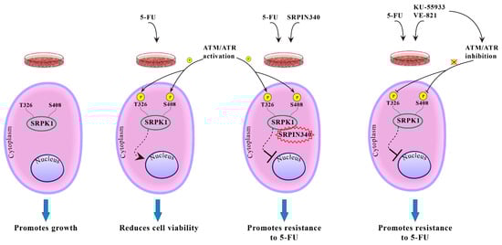 Summarizing our results, we propose a model for SRPK1 activity and function in relation to its subcellular localization (Figure 11). In untreated cells, SRPK1 localizes almost exclusively in the cytoplasm and promotes cell growth. Treatment with 5-FU induces the phosphorylation of Thr326 and Ser408 in an ATR/ATM-dependent manner, thus resulting in the relocation of the kinase from the cytoplasm to the nucleus. Nuclear SRPK1 mediates the cytotoxic effects of the drug and reduces cell viability. Blocking SRPK1 activity by SRPIN340 or blocking the activity of ATR/ATM by KU-55,933/VE-821 impairs the nuclear translocation of SRPK1 and confers resistance to the drug.