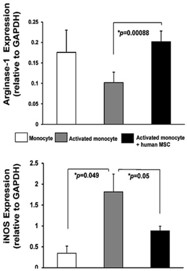 Protein expression in (white) quiescent or activated (gray, Mø) monocytes and in (black) Mø incubated with human mesenchymal stromal/stem cells (MSC). Western blotting showed increased iNOS (inducible nitric oxide synthase) (reflecting a primarily M1 phenotype) expression in activated monocytes that MSC inhibited, while arginase-1 increased (reflecting a transition to a primarily M2 phenotype). GAPDH (glyceraldehyde-3-phopsphate dehydrogenase) was used as a loading control for immunofluorescence assays. These data in vitro support the capacity for human adipose-derived MSC to modify macrophage phenotypes, consistent with the experimental data indicating such a shift is required to repair tubular integrity after AKI. Data from S. Textor and L. Lerman, with permission.