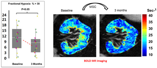 It should be emphasized that these Phase 1a studies were undertaken without endovascular dilation of the large vessel stenosis. As expected, the stenotic kidneys were characterized by reduced cortical and medullary volumes and substantially reduced renal blood flows. They were also characterized by more widespread evidence of tissue hypoxia (measured as the fraction of kidney tissue with R2* levels above 30 [28]) as compared with the contralateral kidneys. Several notable changes were seen after three months. In particular, the level of cortical perfusion (blood flow/cubic mL of tissue) rose from 2.3 (1.4–2.5) to 2.6 (1.6–3.2) ml/mi/cc tissue, p = 0.03. No changes in the measured volumes were observed, but the cortical and total renal blood flows rose 15–20% in the stenotic kidney due to increased perfusion (from 164 ± 99 to 190 ± 126 mL/min, p = 0.007). No such changes were observed in the patients undergoing the identical protocol studies without MSC administration [56,57]. Importantly, BOLD measurements after three months demonstrated reductions in the fractional hypoxia >30 s−1 for the stenotic kidneys (Figure 5). We interpret these findings to suggest that microvascular changes in a post-stenotic kidney allow increased cortical circulation with concomitant relief of tissue hypoxia. It is important to note that similar changes in cortical perfusion were also observed in the contralateral kidney that had not undergone MSC infusion. Cortical perfusion rose, although no changes in R2* were seen, which was already low and reflected minimal overt hypoxia in the non-stenotic kidneys. A slight rise in medullary perfusion was observed, and overall renal blood flow rose to a similar degree as that observed in the stenotic kidney. These observations suggest that systemic effects, likely from paracrine mediators and/or renal crosstalk, affected the contralateral kidney as well as the stenotic side. Again, the observed changes in the contralateral kidney were different after MSC infusion from changes in the kidneys treated with medical therapy only or endovascular stent placement [57].