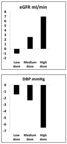 Average dose-related changes in the estimated glomerular filtration rate (eGFR) and arterial diastolic blood pressure (DBP) observed after three months in patients with ARVD treated with intraarterial infusion of autologous adipose-derived MSC. These were associated with reduced levels of tissue hypoxia and increased cortical blood flow (see text). Doses included were 1 × 105, 2.5 × 105 and 5 × 105 cells/kg into a single renal artery.