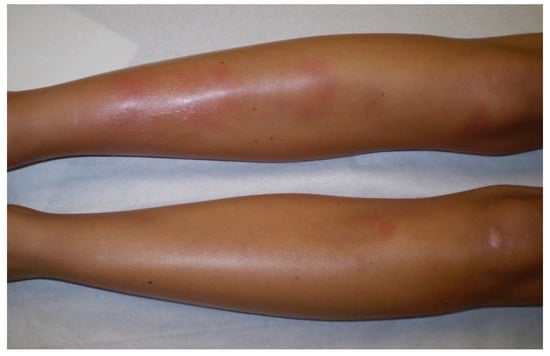 Löfgren’s syndrome (LS), first described in 1952 by Swedish Professor of Medicine Sven Löfgren, is a clinically distinct phenotype of sarcoidosis. Patients typically experience an acute onset of the disease, usually with fever (53.4%) and characteristic symptoms consisting in bilateral hilar lymphadenopathy, erythema nodosum (Figure 3) (57–100%) and/or bilateral ankle arthritis or periarticular inflammation (81.2%) [55]. LS occurs mostly in European Caucasians, especially in Sweden and in the Netherlands where LS patients constitute roughly a third of all sarcoidosis cases. It is less common in the United Kingdom and in the US, where only 0.9 and 0.7% of sarcoidosis patients present with LS, respectively, and is extremely rare in Asia. It usually occurs between the age of 25 to 40, with a second peak around the age of 40 to 60 and is more frequent in women (70%) [56]. The different manifestations of LS differ according to sex. Erythema nodosum is found predominantly in women while arthropathy/arthritis is more common in men. In Löfgren’s original cohort as well as in more recent studies, most patients (79–82.5%) present with radiographic stage I, 14.6–23% have stage II disease while no patient present with stage III/IV [55,56]. On average 2% of the patients have no radiographic abnormalities. Magnetic resonance imaging (MRI) of the joints or ultrasonography typically shows periarticular inflammation with subcutaneous and soft tissue edema accompanied by small amounts of joint and tenosynovial fluid without evidence of synovial thickening or synovitis [57,58]. LS patients herald a benign and self-remitting disease, which is especially true for individuals carrying the HLA-DRB1*03 allele. Chronic trend >2 years occurs in 8 to 22.6% of LS patients and is associated with older age, stage II at diagnosis and the need for treatment [55]. Apart from erythema nodosum, fever, articular involvement and extrapulmonary manifestations have been reported in only 12% of LS patients [16]. Among them, uveitis, parotitis, facial palsy, skin (except lupus pernio), liver or spleen involvement have been described as more frequently associated with LS.