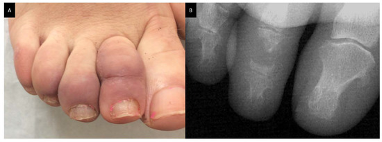 Bone sarcoidosis is observed in 0.5% to 30% of patients depending on the sensitivity of imaging procedures and is frequently associated with lupus pernio, uveitis and a chronic multisystemic course of the disease [60]. On the other hand, Sparks et al. reported only 20 cases (1.5%) of osseous involvement detected in 2013 patients with sarcoidosis identified between 1994 and 2013 at Brigham and Women’s Hospital in Boston, Massachusetts [66]. Bone lesions are asymptomatic in half cases. They are commonly located in the phalanges of the hands and feet and are usually bilateral. Dactylitis typically involves the bones and soft tissue with slight swelling, tenderness and limitations of the movement (Figure 4A). The skull, as well as long bones, ribs, pelvis and axial skeleton may also be affected. Radiographic investigations may revelate sclerotic (typically in the spine) and/or osteolytic lesions, cystic and punched out lesions and cortical abnormalities (Figure 4B). Vertebral sarcoidosis can affect lower thoracic and upper lumbar vertebrae and may mimic metastatic lesions. The use of more sensitive imaging procedures, such as MRI or nuclear imaging, reveals a higher rate of bone involvement than does radiography [67,68]. Using fluorine-18 fluorodeoxyglucose positron emission tomography/computed tomography (18F-FDG PET CT), Demaria et al. have recently shown that bone sarcoidosis occurs in 14% of patients with sarcoidosis and affects multiple bones and mostly the axial skeleton (spine then pelvis, then sternum). Only patients with hand involvement had bony symptoms (pain and/or swelling) [69].