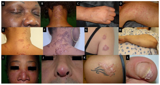 According to studies, skin is the second or third most commonly affected organ in sarcoidosis, present in up to one-third of the patients [84]. Cutaneous sarcoidosis lesions are frequently the inaugural signs of the disease and sarcoidosis can remain an isolated dermatological condition in more than 30% of cases [85]. In patients with cutaneous and systemic sarcoidosis, skin findings rise before or at the time of diagnosis in 80% of patients [85]. Recognizing sarcoidosis cutaneous manifestations is of most importance as they are frequently the first sign of the disease and because skin is an easily accessible tissue for biopsy. There are “specific” and “non-specific” findings based on the presence or absence of characteristic sarcoidosic granulomas on histological examination.