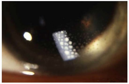Sarcoid uveitis is generally bilateral (75–90%) with the same findings and clinical course in both eyes [88,89]. Anterior uveitis (defined as iritis and/or iridocyclitis) is the most common anatomical form of intraocular inflammation (41–75% of sarcoid uveitis) [88,90,91], followed by posterior, intermediate uveitis and panuveitis. Nevertheless, recent reports from tertiary centers identified panuveitis as the most commonly encountered subtype [89,92]. Anterior uveitis is usually chronic (defined as a relapse within 3 months after treatment discontinuation) [90], bilateral and granulomatous (Figure 6). Uveoparotid fever, also known Heerfordt(–Waldenström)’s syndrome is a highly specific subtype of sarcoidosis [93,94]. It is characterized by a combination of facial palsy, parotid gland enlargement, uveitis and is associated with low-grade fever [95]. Cases that manifest with all of the three symptoms are called “complete Heerfordt’s syndrome” (0.3% of sarcoidosis patients). If only two of the three characteristic symptoms are present, it is called” incomplete Heerfordt’s syndrome” (1.3%). Heerfordt’s syndrome can be rarely associated with cranial nerve involvement, particularly affecting the trigeminal nerve [96] along with visceral involvement [97].