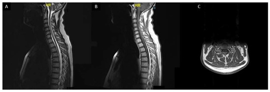 Spinal cord sarcoidosis (SCS) occurs in less than 1% of all patients [167,168,169]. In comparison with other myelopathies, neurologic pain seems to be more frequent and may be considered as an alarm for early diagnosis of SCS [170]. Sarcoidosis associated myelitis is usually extensive (more than three vertebral levels) with a subacute/progressive onset compared with other myelopathies (vascular, inflammatory, or infectious myelopathies) (Figure 7). A distinct MRI phenotype, with enhancement in subpial and/or meningeal areas, also called “trident sign”, is seen in sarcoidosis-associated myelopathy and can help the diagnosis [171].