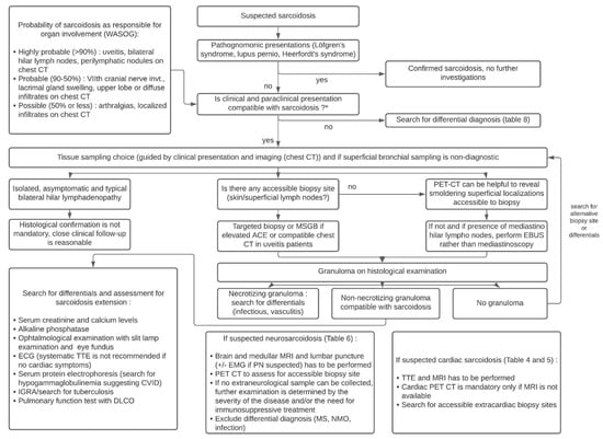 A total of 16 studies were conducted in 556 asymptomatic patients with suspected radiographic stage 1 sarcoidosis and showed that sarcoidosis was confirmed in 85% of patients, while an alternative diagnosis was made in 1.9% (i.e., tuberculosis in 38% of cases and lymphoma in 25% of cases). Sampling was non-diagnostic in 11% of cases. Based on these data, experts make no recommendation for or against obtaining a lymph node sample in asymptomatic patients whose changes in the radiological image indicating bilateral hilar lymphadenopathy. The need for closer clinical examination is emphasized in patients whose biopsy was postponed. The third recommendation, for patients with suspected sarcoidosis along with hilar/mediastinal lymphadenopathy, is to perform Endobronchial Ultrasound (EBUS)-guided lymph node sampling, rather than mediastinoscopy (conditional recommendation, very low quality). Agrawal et al. recently performed a systematic review and meta-analysis which yielded, for sarcoidosis, a pooled overall diagnostic yield of 93% for EBUS-intranodal forceps biopsy vs. 58% for EBUS-transbronchial needle biopsy (p < 0.00001) [202]. Figure 8 provides an algorithm based on recent ATS guidelines for the diagnosis of sarcoidosis and that incorporates the value of minor salivary gland biopsy (MSGB) and 18F-FDG PET in sarcoidosis diagnosis [27,36,99]. Two studies in uveitis patients showed that granulomas were only found on MSGBs in patients with elevated ACE or with a compatible chest CT [203,204].