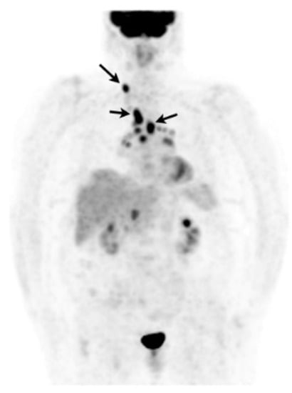 In case of poorly accessible organ localization without superficial nor thoracic manifestation (e.g., cardiac or neurosarcoidosis) 18F-FDG PET may show a suggestive sarcoid-like uptake pattern with hypermetabolic mediastinal and hilar lymph nodes, whether or not combined with lung parenchymal active disease which supports the likelihood of sarcoidosis and orientates a mediastinoscopy [205]. 18F-FDG PET may sometimes reveal smoldering superficial localizations, for example, cervical lymph nodes which are easily accessible to biopsy (Figure 9) [206]. The value of EBUS-guided lymph node sampling in patients with hypermetabolic lymph nodes on 18F-FDG PET remains to be studied.