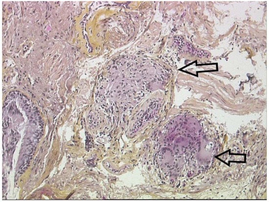 - Rosen, Y. Four Decades of Necrotizing Sarcoid Granulomatosis: What Do We Know Now? Arch. Pathol. Lab. Med. 2015, 139, 252–262. [Google Scholar] [CrossRef]